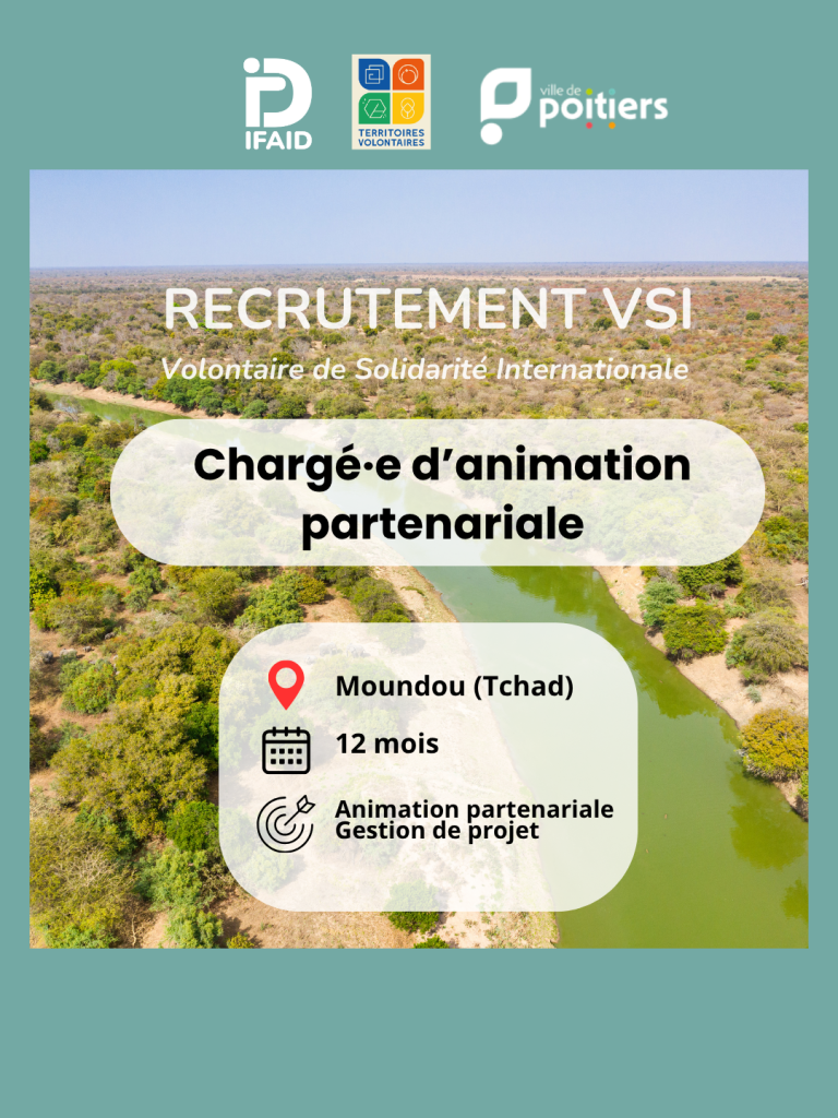Volontariat de Solidarité Internationale (VSI) IFAID, dans le cadre de sa mission d’envoi de Volontaires de Solidarité Internationale,recherche, pour la Ville de Poitiers, un·e volontaire pour une mission de 12 mois au Tchad. Cadre général de la mission Statut : Volontariat de Solidarité Internationale VSI : statut de droit français, cadre législatif : loi n°2005-159 […]